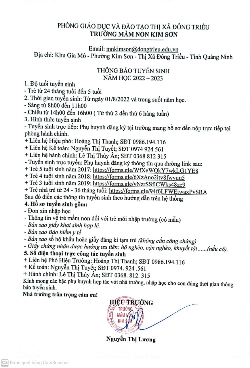 Thông tin tuyển sinh TRƯỜNG MN KIM SƠN
